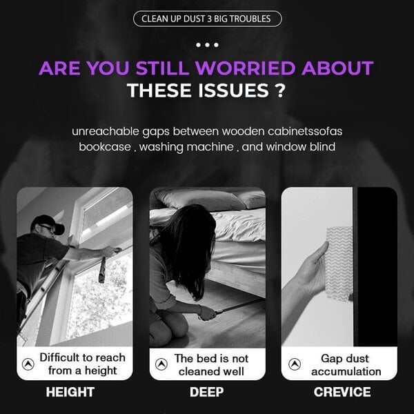 Easy to clean areas that are hard to reach, drive away dust with no effort at all. Widely use for unreachable gaps between wooden cabinets, sofas, bookcases, washing machines, and window blinds.