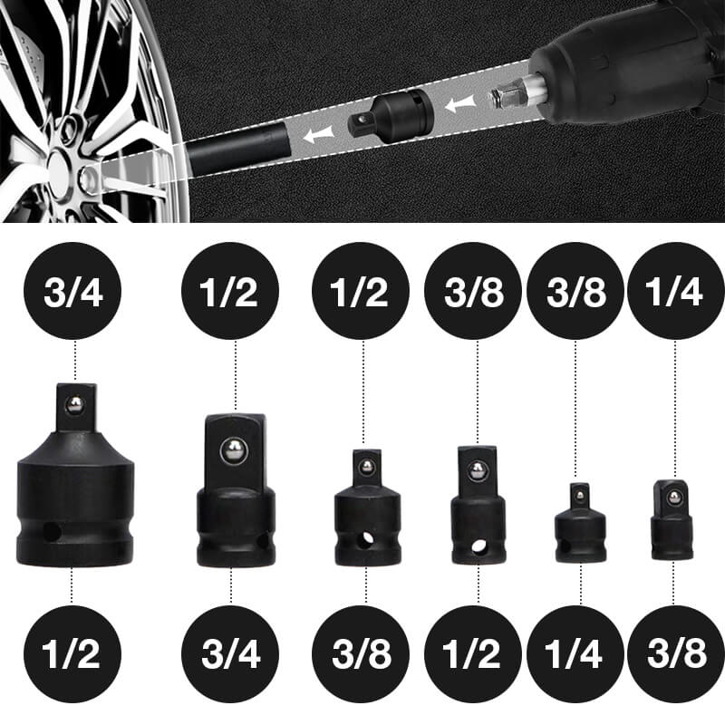 Complete impact drive socket adapter set, with convenient conversion and strong compatibility, can meet all your needs. Designed for drivers, wrenches and ratchets. It can be used with pneumatic tools, electric tools or driving tools.